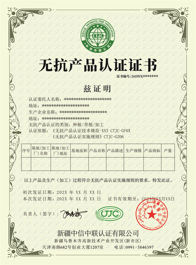 中信中聯(lián)-無(wú)抗產(chǎn)品認證證書(shū)模版